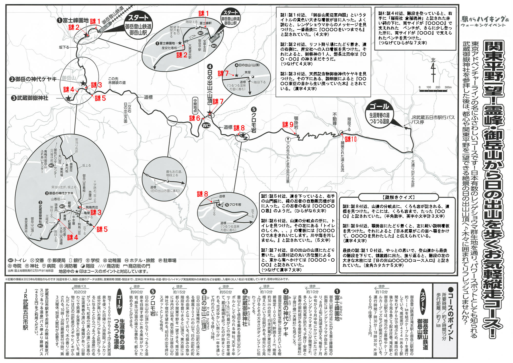 あなたがクリックした謎問題:『地図の謎1付近、「御岳山周辺案内図」というタイトルの黄色い大きな看板が目に入った。よく読むと、レンゲショウマからのメッセージを見つけた。一番最後に『○○○○をいつまでも』と記されていた。(4文字)』