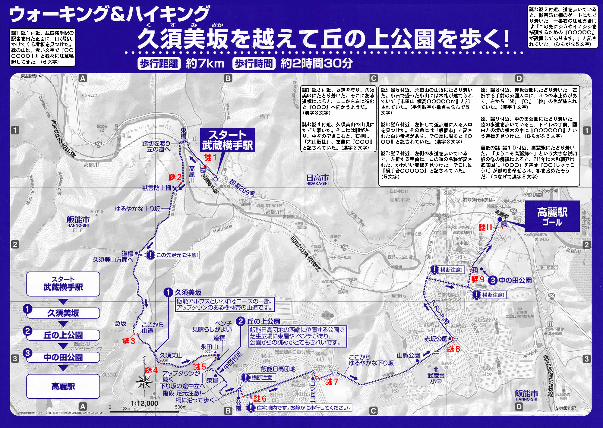 あなたがクリックした謎問題:『地図の謎1付近、武蔵横手駅の駅舎を出た正面に、山が話しかけてくる看板を見つけた。緑の山は、赤い文字で『○○○○○○!』と我々に注意喚起してきた。(6文字)』