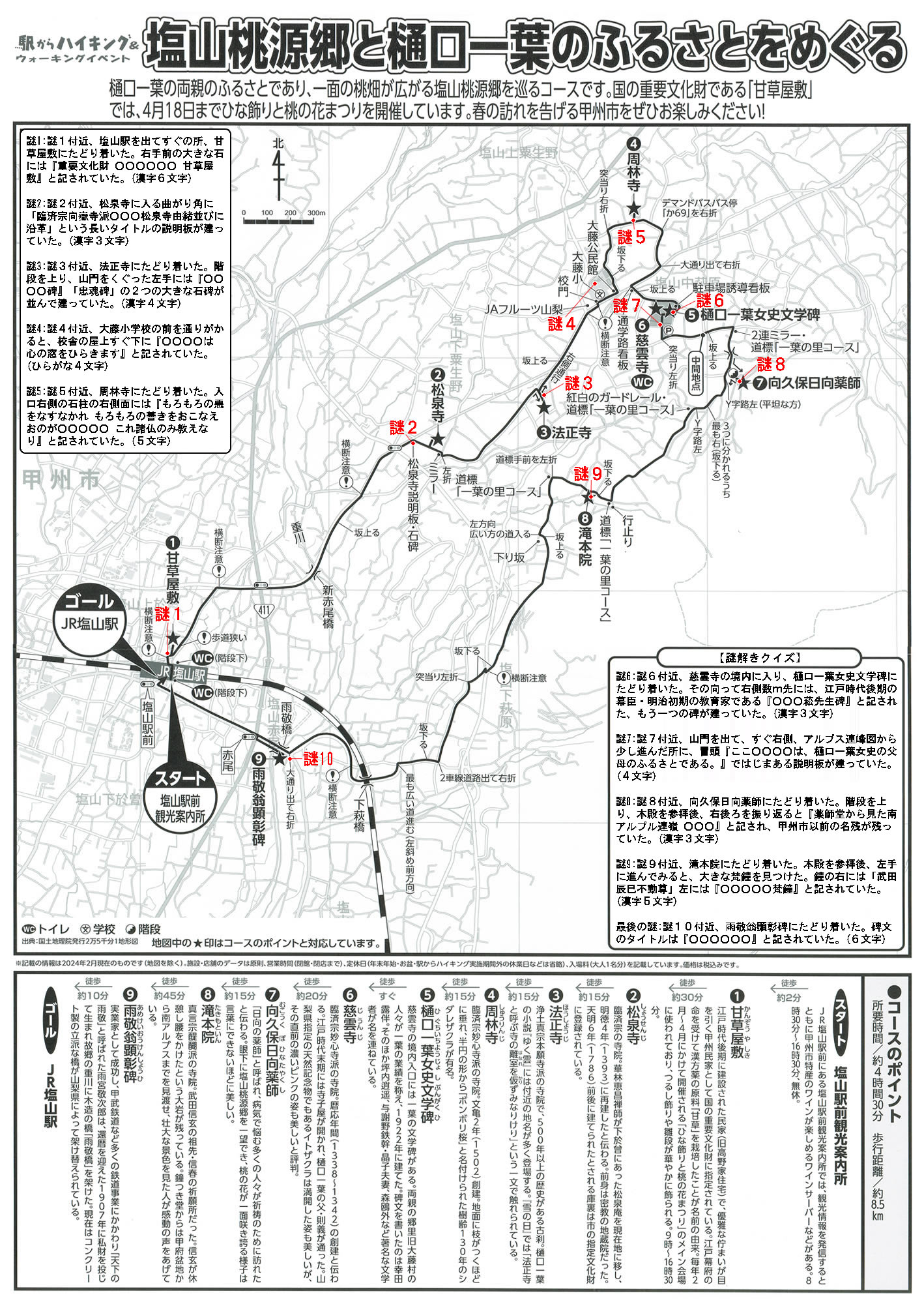 あなたがクリックした謎問題:『地図の謎8付近、向久保日向薬師にたどり着いた。階段を上り、本殿を参拝後、右後ろを振り返ると『薬師堂から見た南アルプル連嶺 ○○○』と記され、甲州市以前の名残が残っていた。(漢字3文字)』