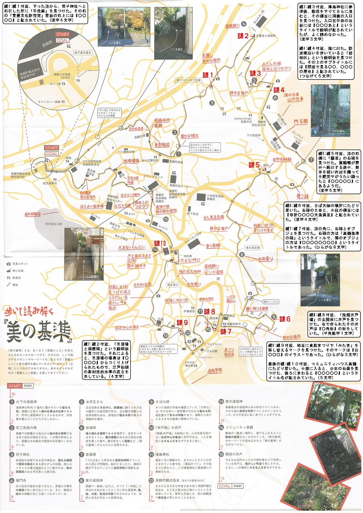 あなたがクリックした謎問題:『地図の謎7付近、道の角に、石碑とオブジェを見つけた。石碑の方は「真鶴漁港の碑」というタイトルで、隣のオブジェの方は『○○○○○○○○』というタイトルであった。(ひらがな8文字)』