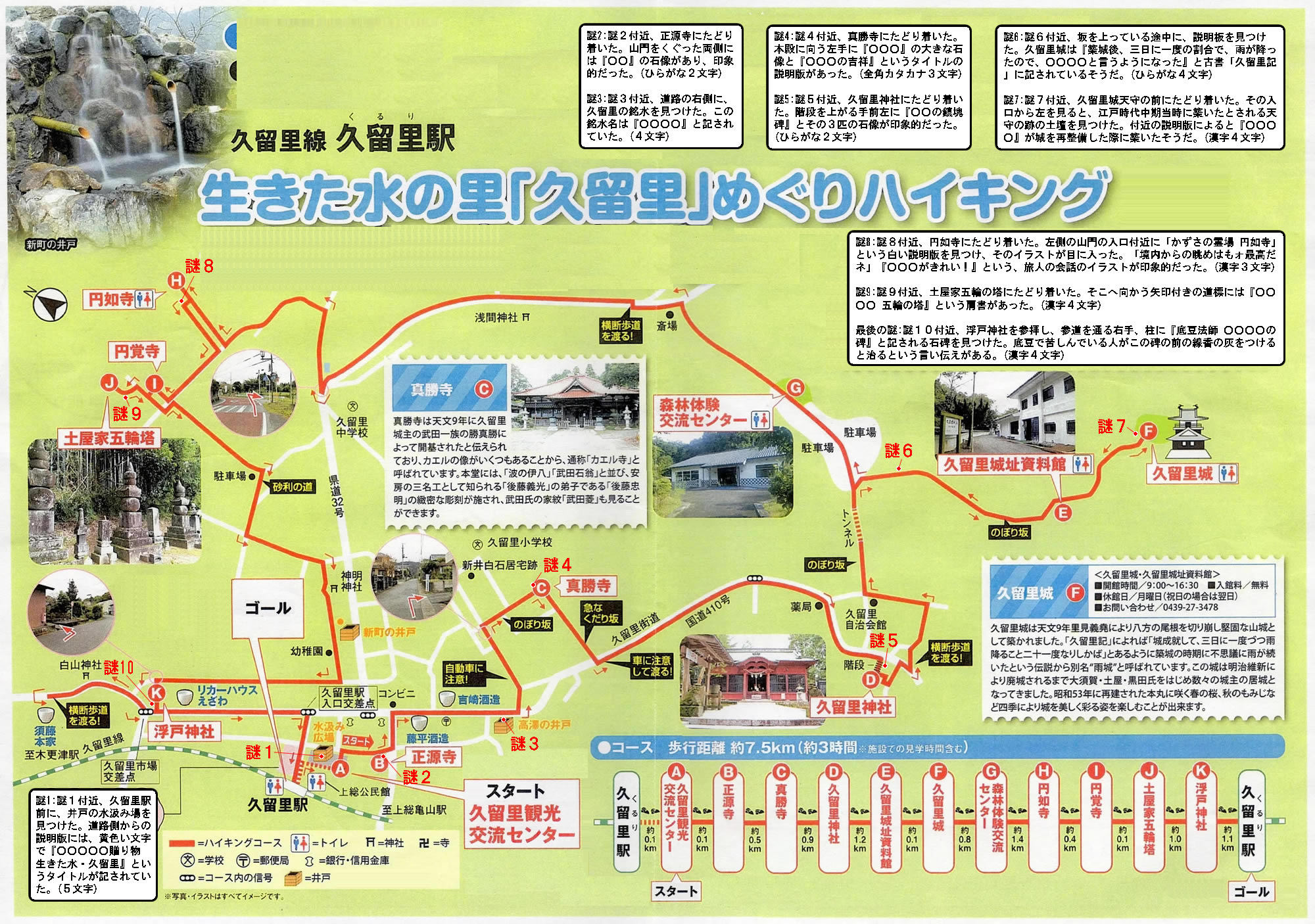 謎1:地図の謎1付近、久留里駅前に、井戸の水汲み場を見つけた。道路側からの説明版には、黄色い文字で『○○○○○贈り物 生きた水・久留里』というタイトルが記されていた。(5文字)
