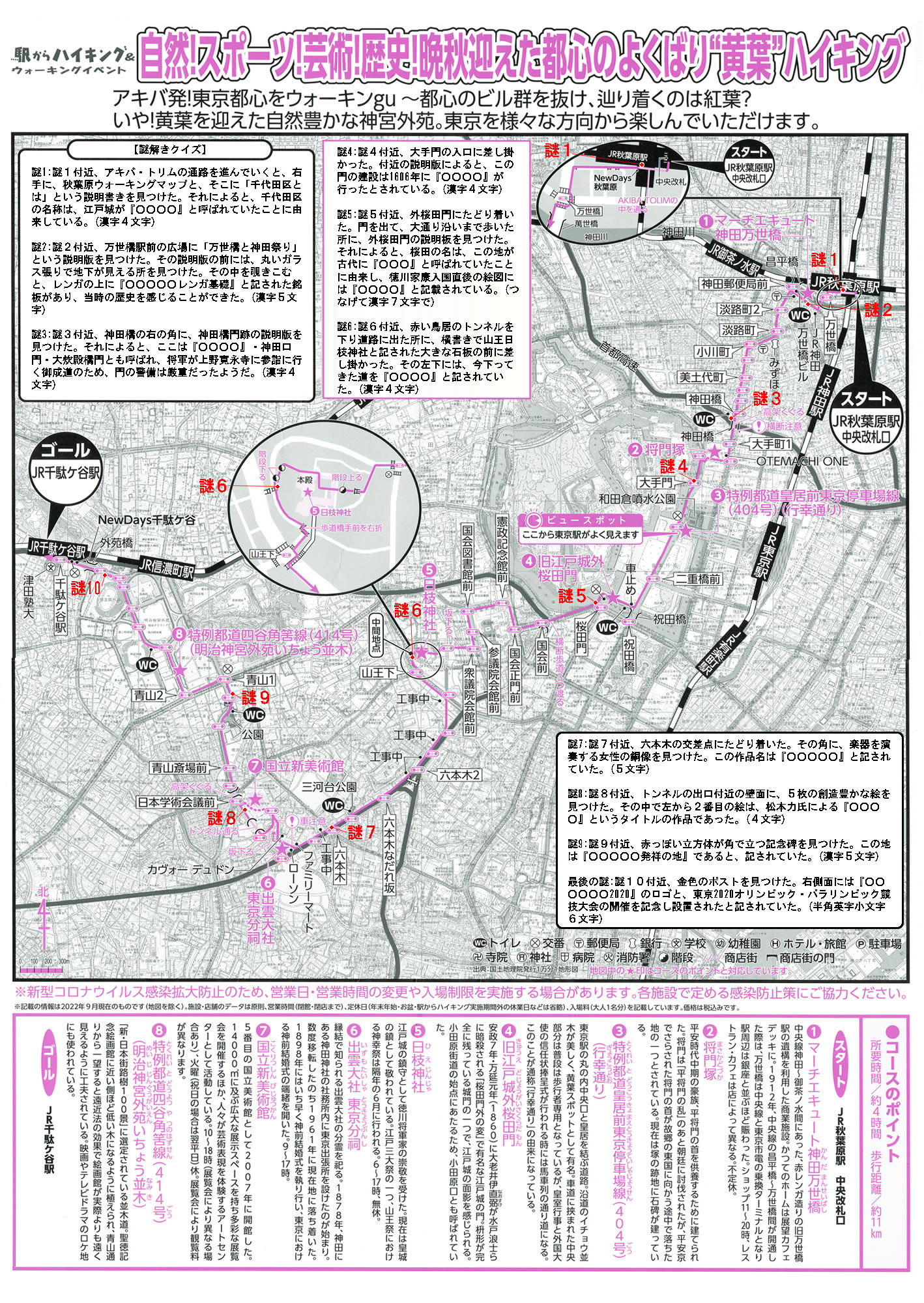 謎1:地図の謎1付近、アキバ・トリムの通路を進んでいくと、右手に、秋葉原ウォーキングマップと、そこに「千代田区とは」という説明書きを見つけた。それによると、千代田区の名称は、江戸城が『○○○○』と呼ばれていたことに由来している。(漢字4文字)