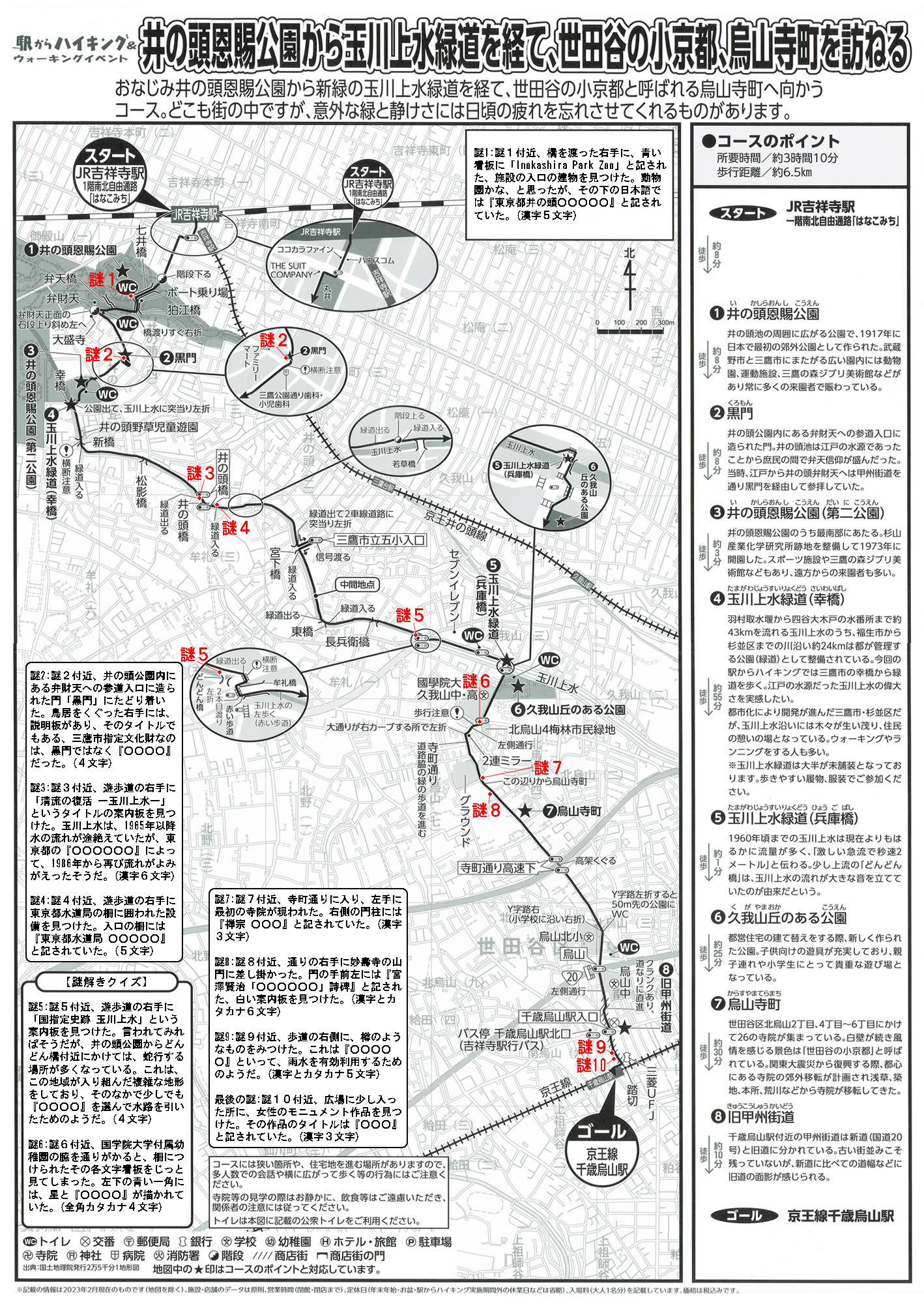 謎1:地図の謎1付近、橋を渡った右手に、青い看板に「Inokashira Park Zoo」と記された、施設の入口の建物を見つけた。動物園かな、と思ったが、その下の日本語では『東京都井の頭○○○○○』と記されていた。(漢字5文字)