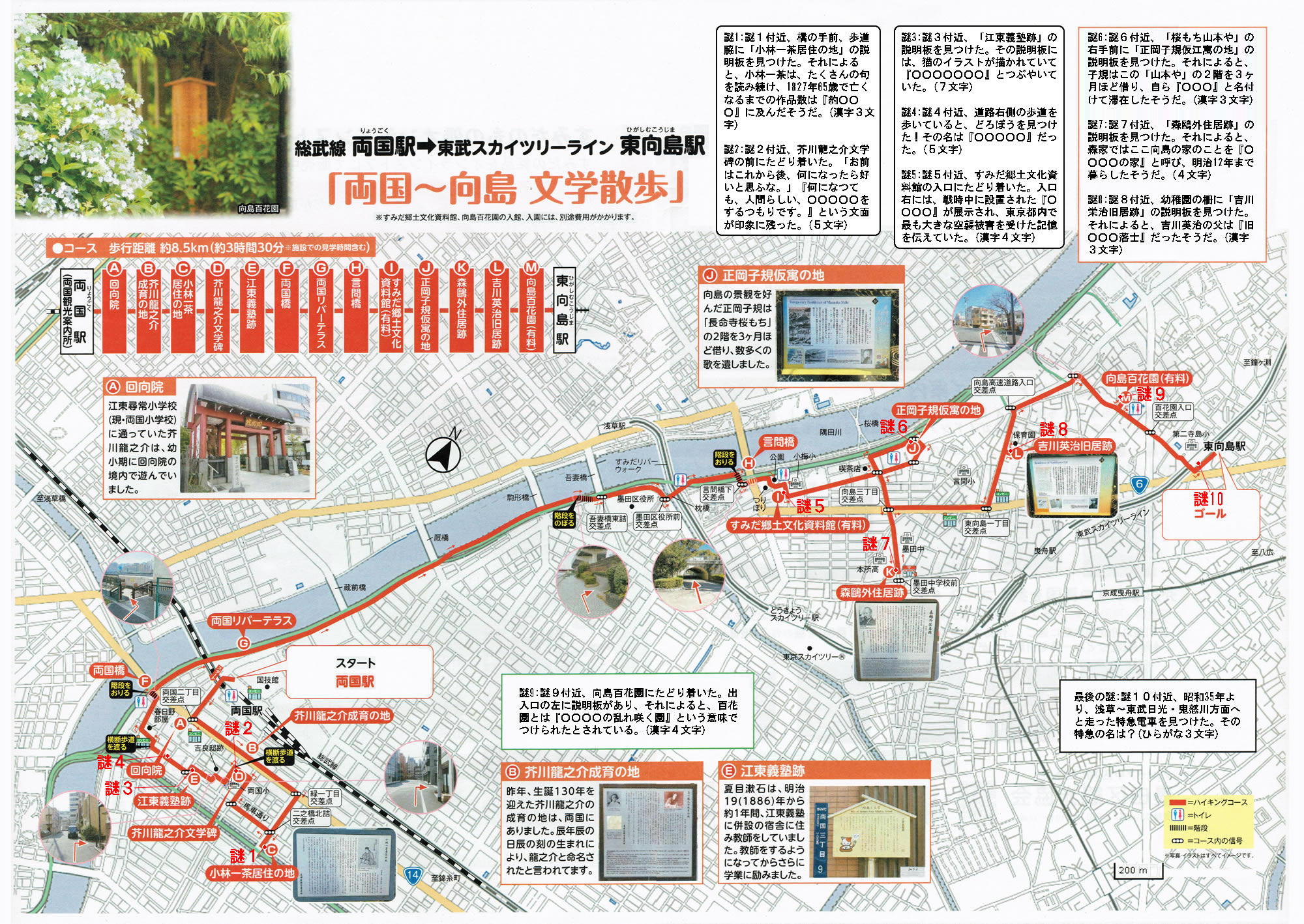 謎1:地図の謎1付近、橋の手前、歩道脇に「小林一茶居住の地」の説明板を見つけた。それによると、小林一茶は、たくさんの句を読み続け、1827年65歳で亡くなるまでの作品数は『約○○○』に及んだそうだ。(漢字3文字)