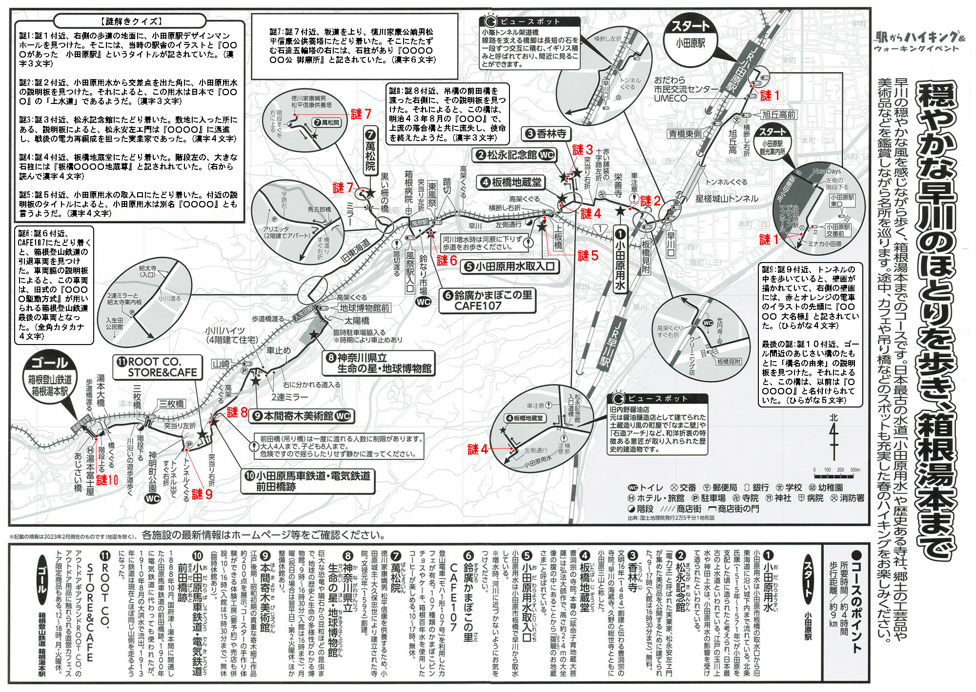 謎1:地図の謎1付近、右側の歩道の地面に、小田原駅デザインマンホールを見つけた。そこには、当時の駅舎のイラストと『○○○があった 小田原駅』というタイトルが記されていた。(漢字3文字)