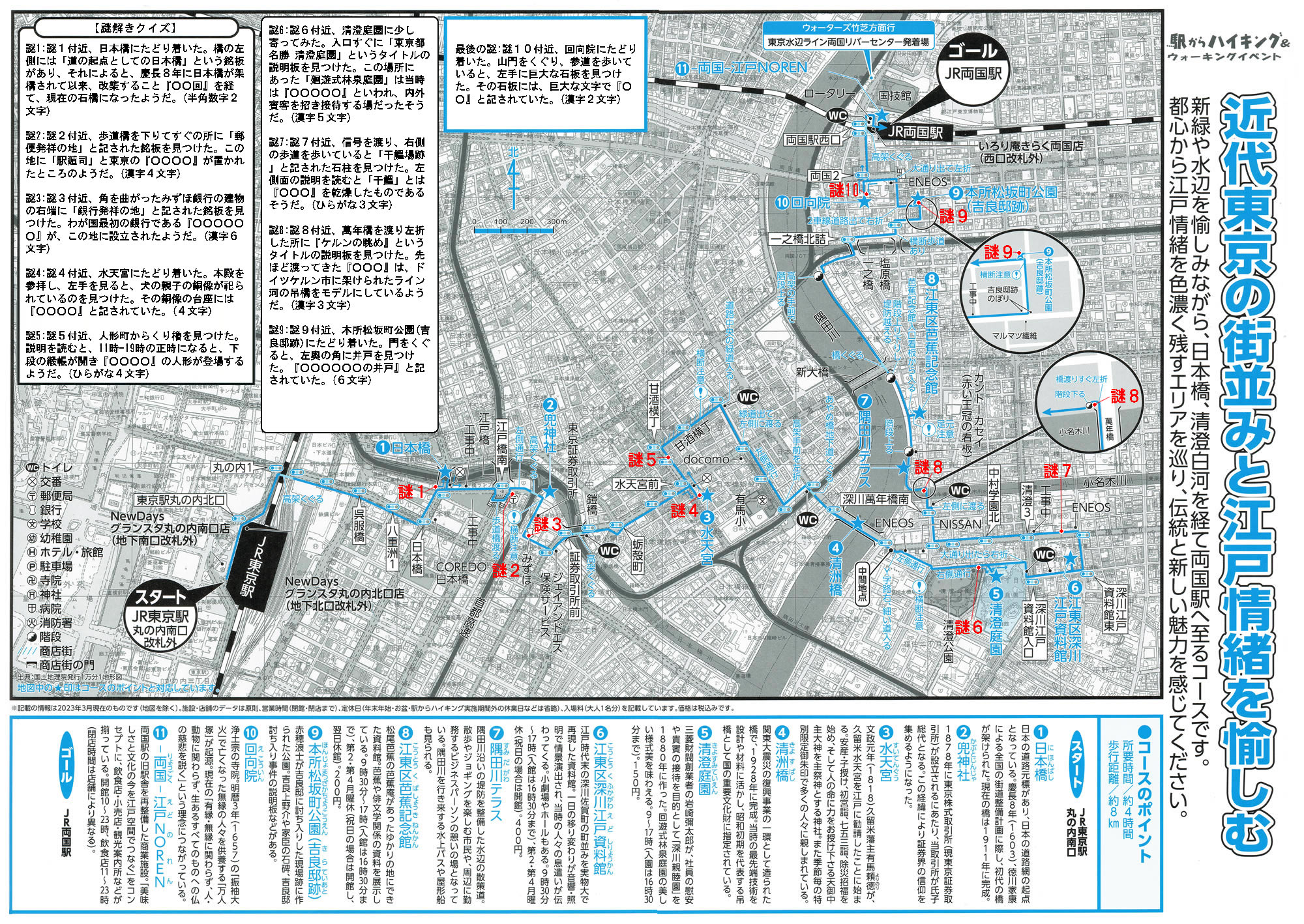 謎1:地図の謎1付近、日本橋にたどり着いた。橋の左側には「道の起点としての日本橋」という銘板があり、それによると、慶長8年に日本橋が架橋されて以来、改築すること『○○回』を経て、現在の石橋になったようだ。(半角数字2文字)