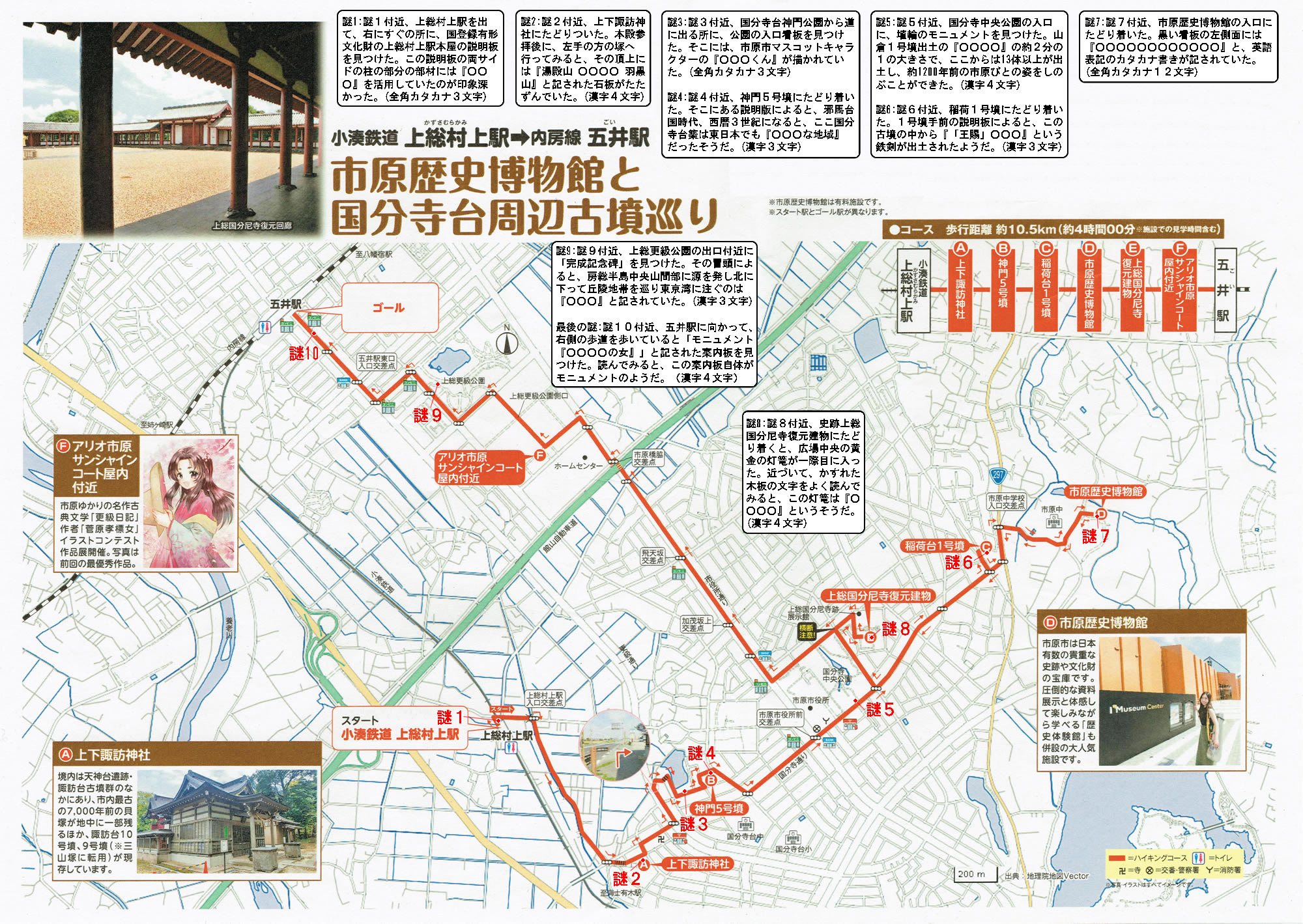 謎1:地図の謎1付近、上総村上駅を出て、右にすぐの所に、国登録有形文化財の上総村上駅本屋の説明板を見つけた。この説明板の両サイドの柱の部分の部材には、古い『○○○』を活用していたのが印象深かった。(全角カタカナ3文字)