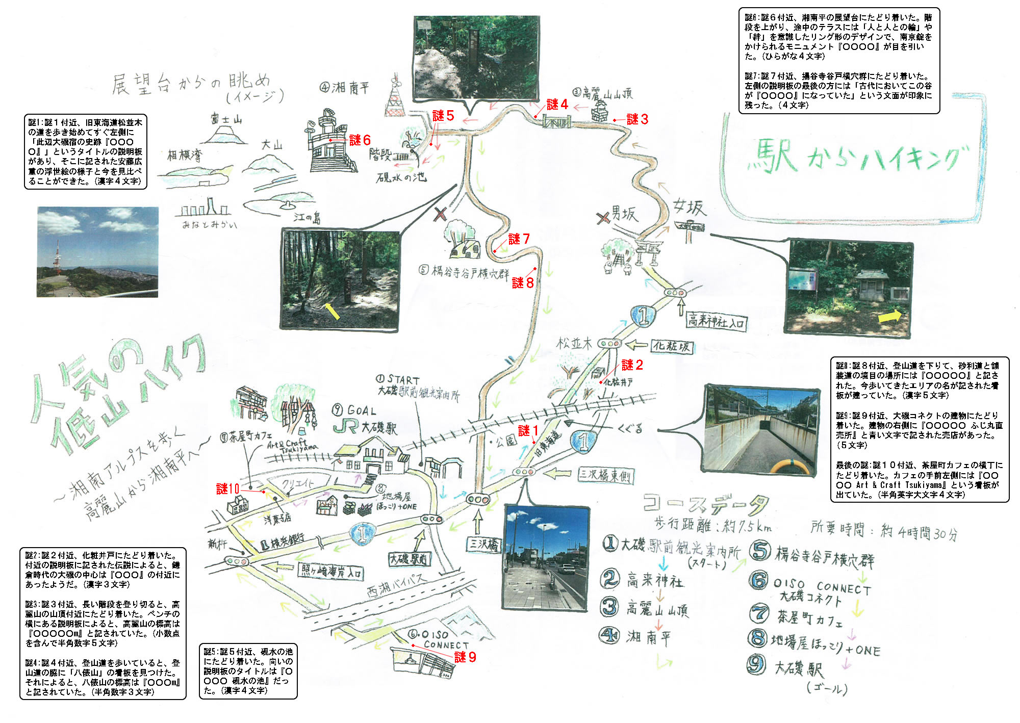 謎1:地図の謎1付近、旧東海道松並木の道を歩き始めてすぐ左側に「此辺大磯宿の史跡『○○○○』」というタイトルの説明板があり、そこに記された安藤広重の浮世絵の様子と今を見比べることができた。(漢字4文字)