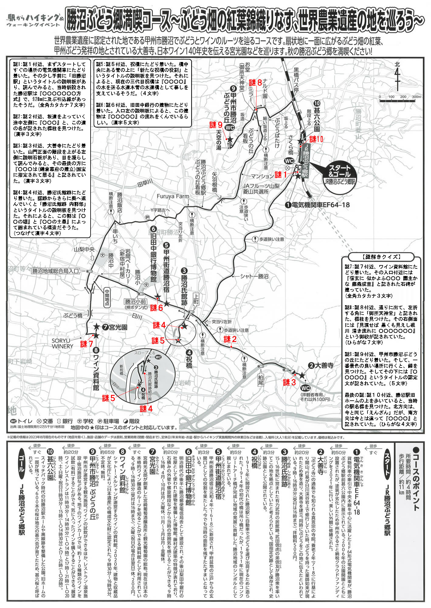 謎1:地図の謎1付近、まずスタートしてすぐの場所の電気機関車にたどり着いた。その少し手前に「旧勝沼駅」というタイトルの説明板があり、読んでみると、当時新設された勝沼駅は『○○○○○○○方式』で、920mに及ぶ引き込み線があったそうだ。(全角カタカナ7文字)