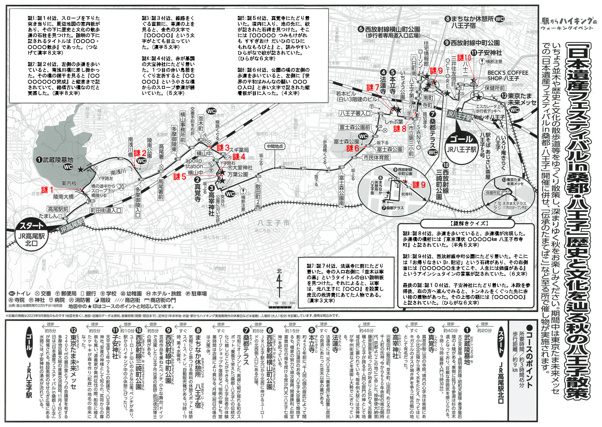 謎1:地図の謎1付近、スロープを下りた突き当りに、周辺地図の案内板があり、その下に歴史と文化の散歩道の石柱を見つけた。説明の下に記されるタイトルは『○○○○・○○○○散歩』であった。(つなげて漢字8文字)