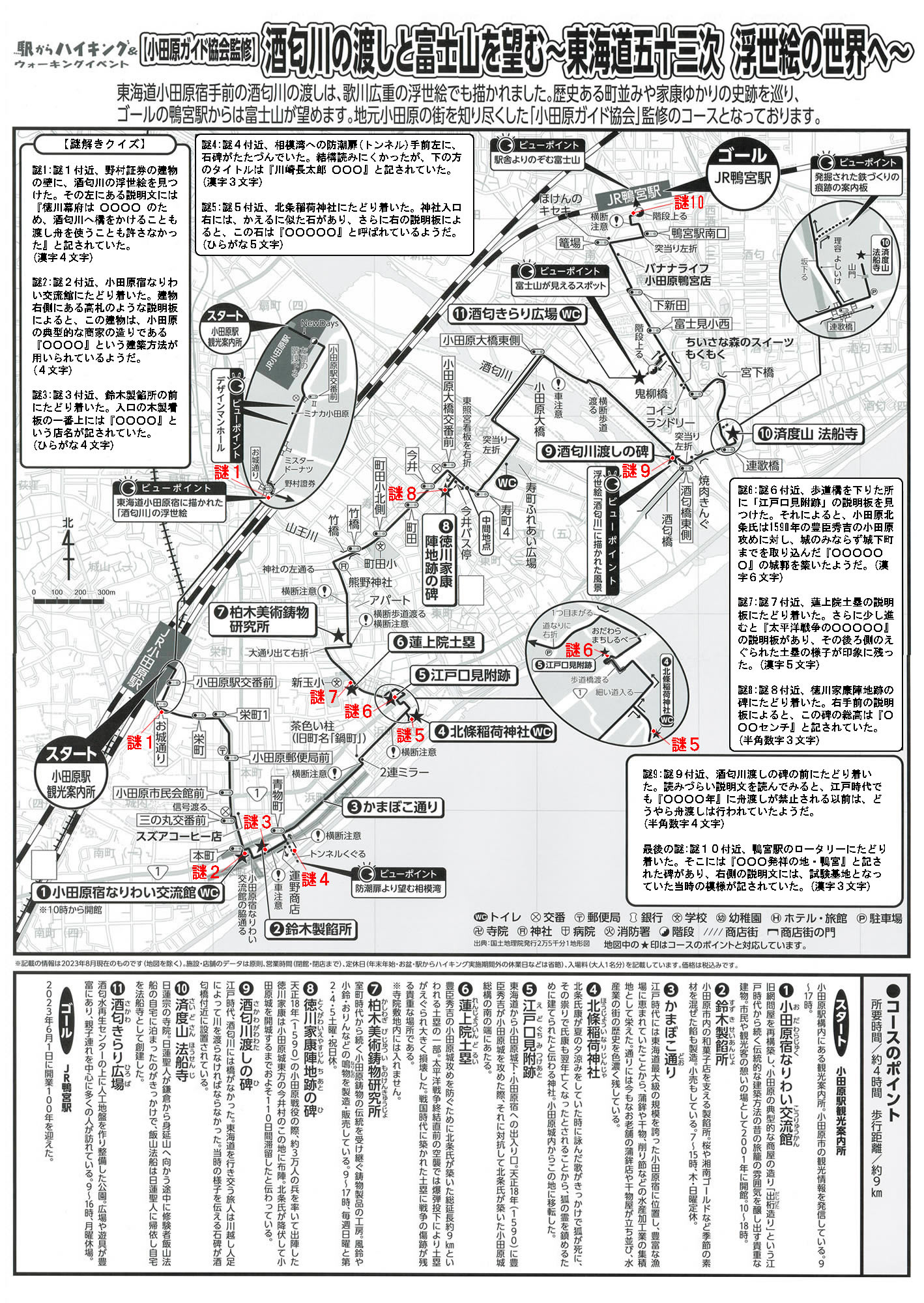 謎1:地図の謎1付近、野村証券の建物の壁に、酒匂川の浮世絵を見つけた。その左にある説明文には『徳川幕府は ○○○○ のため、酒匂川へ橋をかけることも渡し舟を使うことも許さなかった』と記されていた。(漢字4文字)