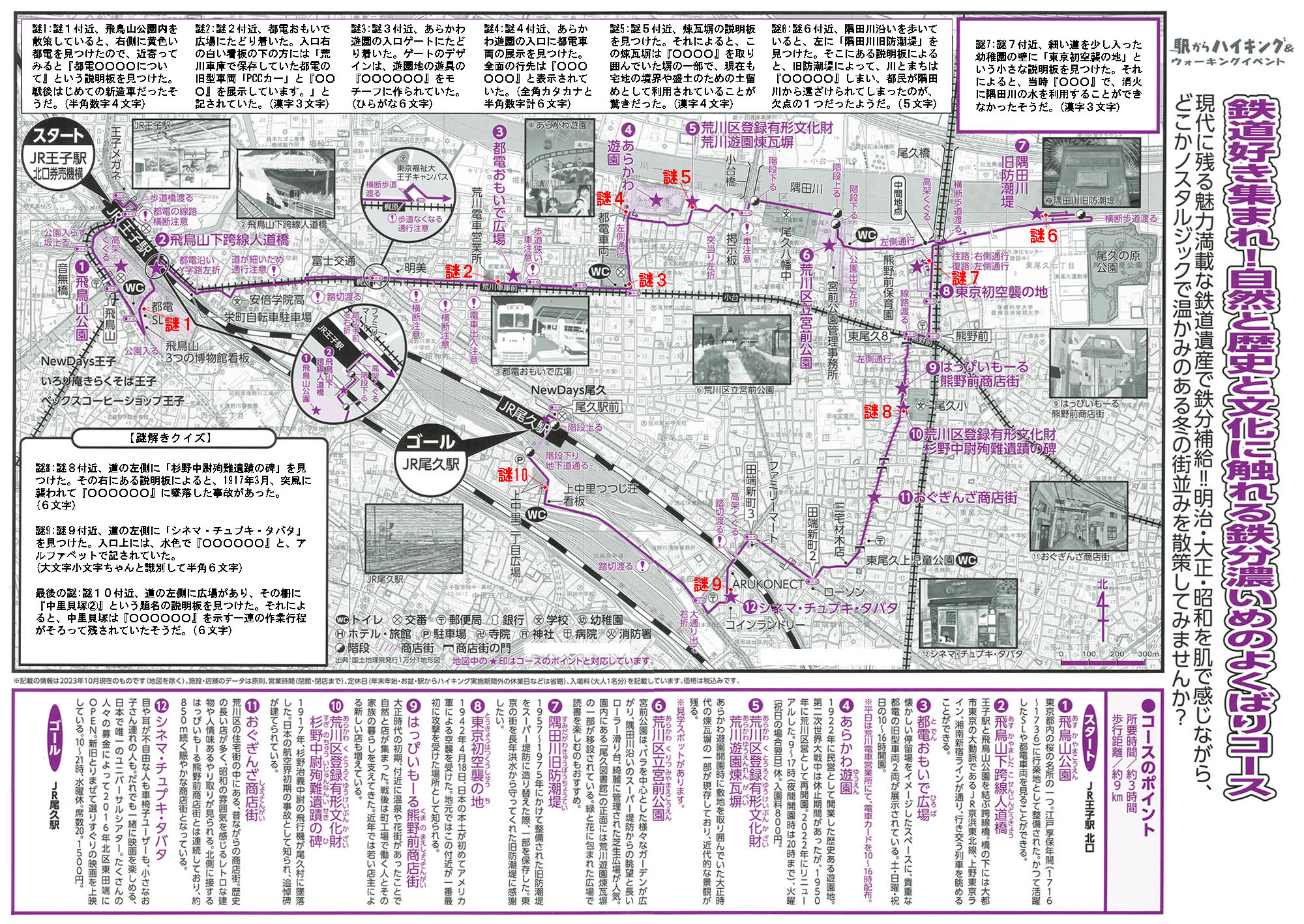 謎1:地図の謎1付近、飛鳥山公園内を散策していると、右側に黄色い都電を見つけたので、近寄ってみると『都電○○○○について』という説明板を見つけた。戦後はじめての新造車だったそうだ。(半角数字4文字)