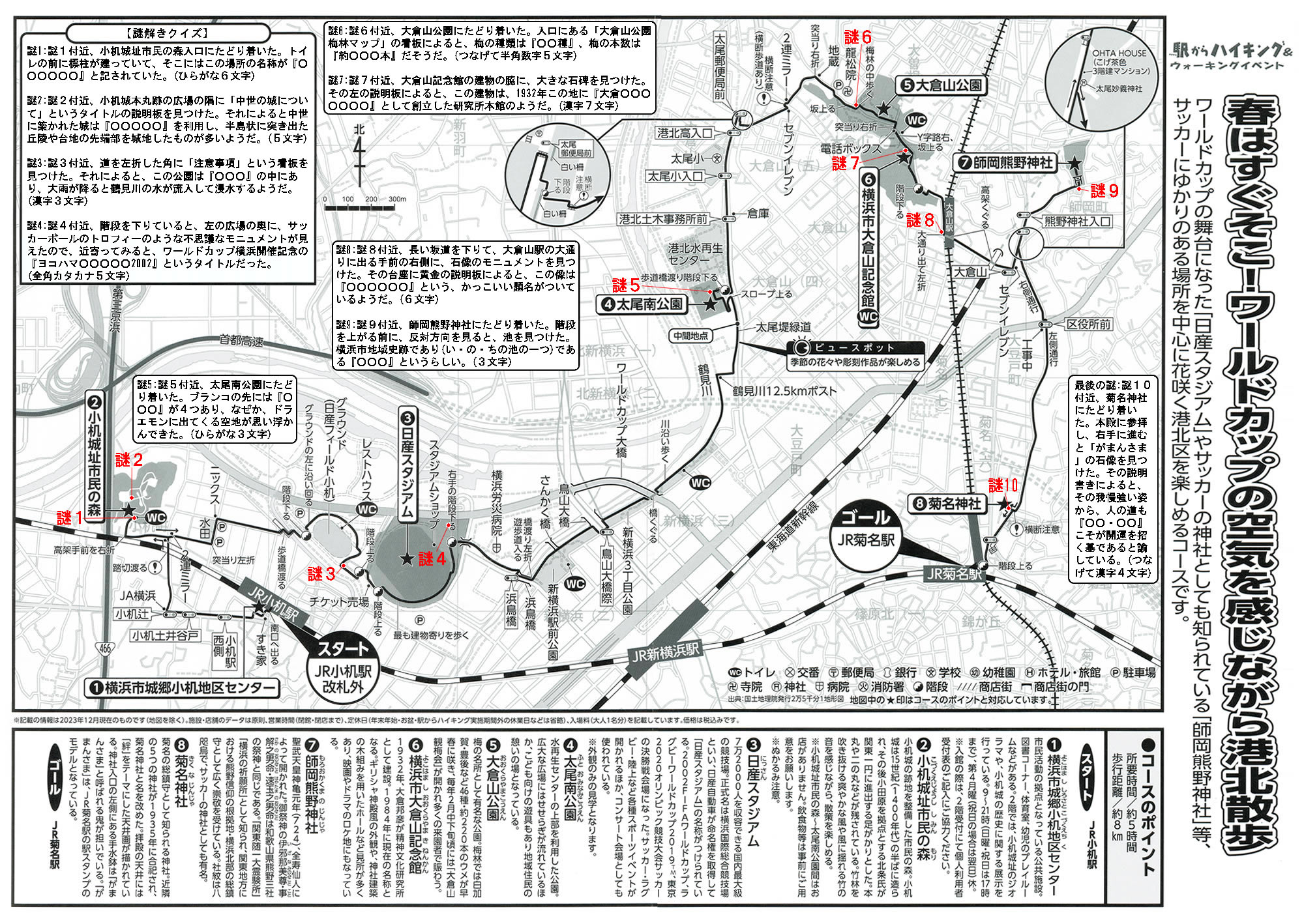 謎1:地図の謎1付近、小机城址市民の森入口にたどり着いた。トイレの前に標柱が建っていて、そこにはこの場所の名称が『○○○○○○』と記されていた。(ひらがな6文字)