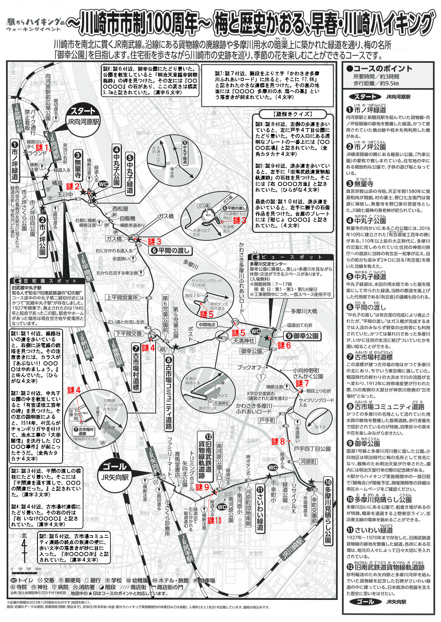 謎1:地図の謎1付近、線路沿いの道を歩いていると、右側に送電線の鉄塔を見つけた。その注意書きには、カラスが『あぶない!! ○○○○はやめましょう。』と叫んでいた。(ひらがな4文字)