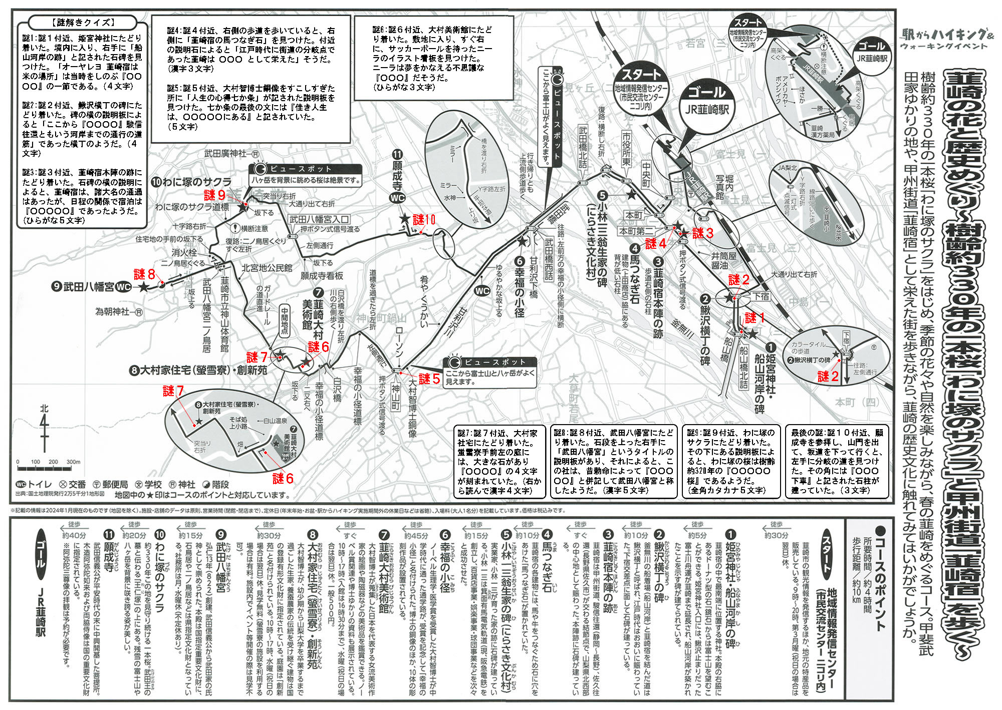 謎1:地図の謎1付近、姫宮神社にたどり着いた。境内に入り、右手に「船山河岸の跡」と記された石碑を見つけた。「オーヤレヨ 韮崎宿は米の場所」は当時をしのぶ『○○○○』の一節である。(4文字)