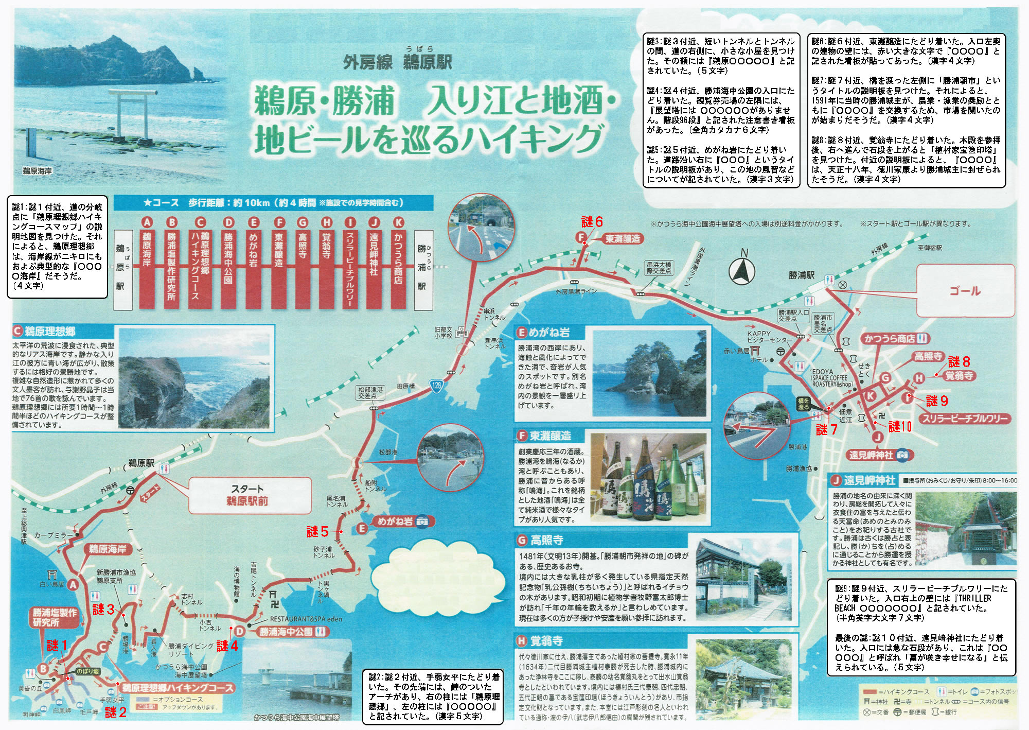 謎1:地図の謎1付近、道の分岐点に「鵜原理想郷ハイキングコースマップ」の説明地図を見つけた。それによると、鵜原理想郷は、海岸線が二キロにもおよぶ典型的な『○○○○海岸』だそうだ。(4文字)