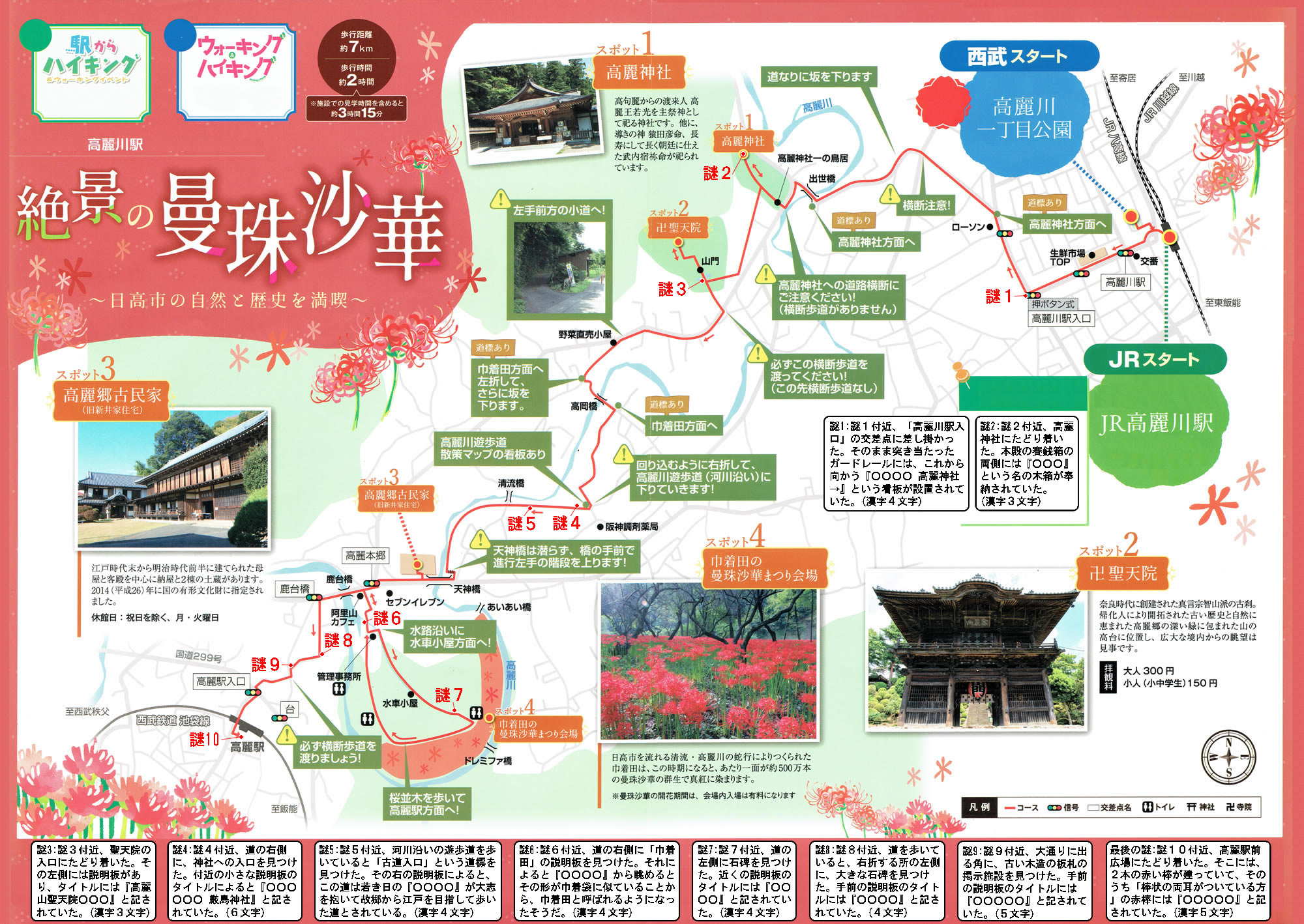 謎1:地図の謎1付近、「高麗川駅入口」の交差点に差し掛かった。そのまま突き当たったガードレールには、これから向かう『○○○○ 高麗神社→』という看板が設置されていた。(漢字4文字)