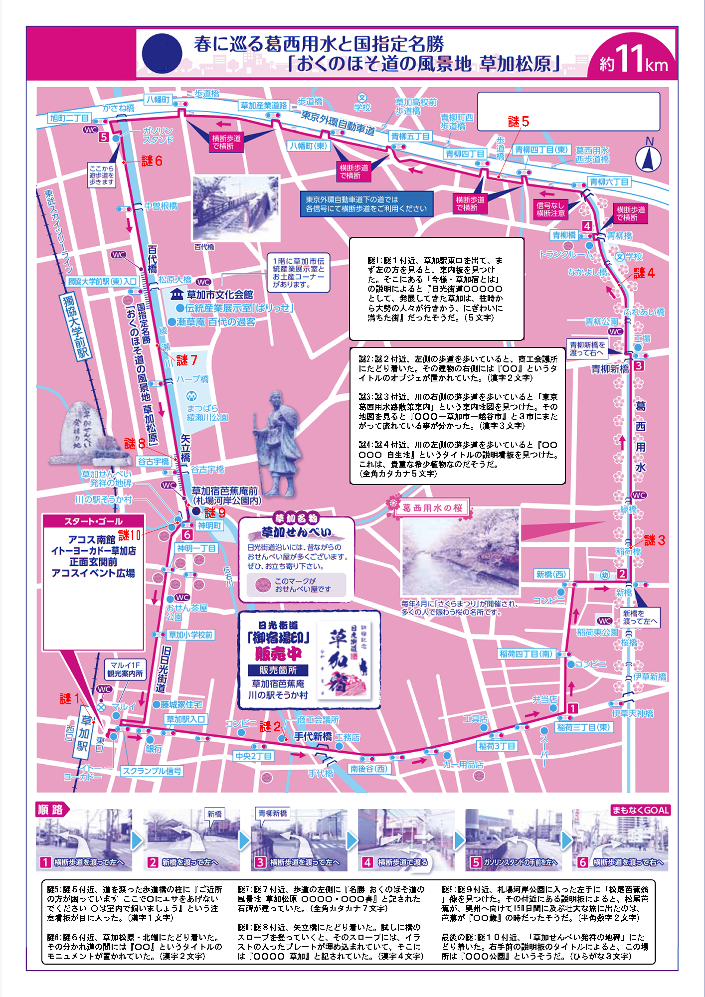 謎1:地図の謎1付近、草加駅東口を出て、まず左の方を見ると、案内板を見つけた。そこにある「今様・草加宿とは」の説明によると『日光街道○○○○○として、発展してきた草加は、往時から大勢の人々が行きかう、にぎわいに満ちた街』だったそうだ。(5文字)