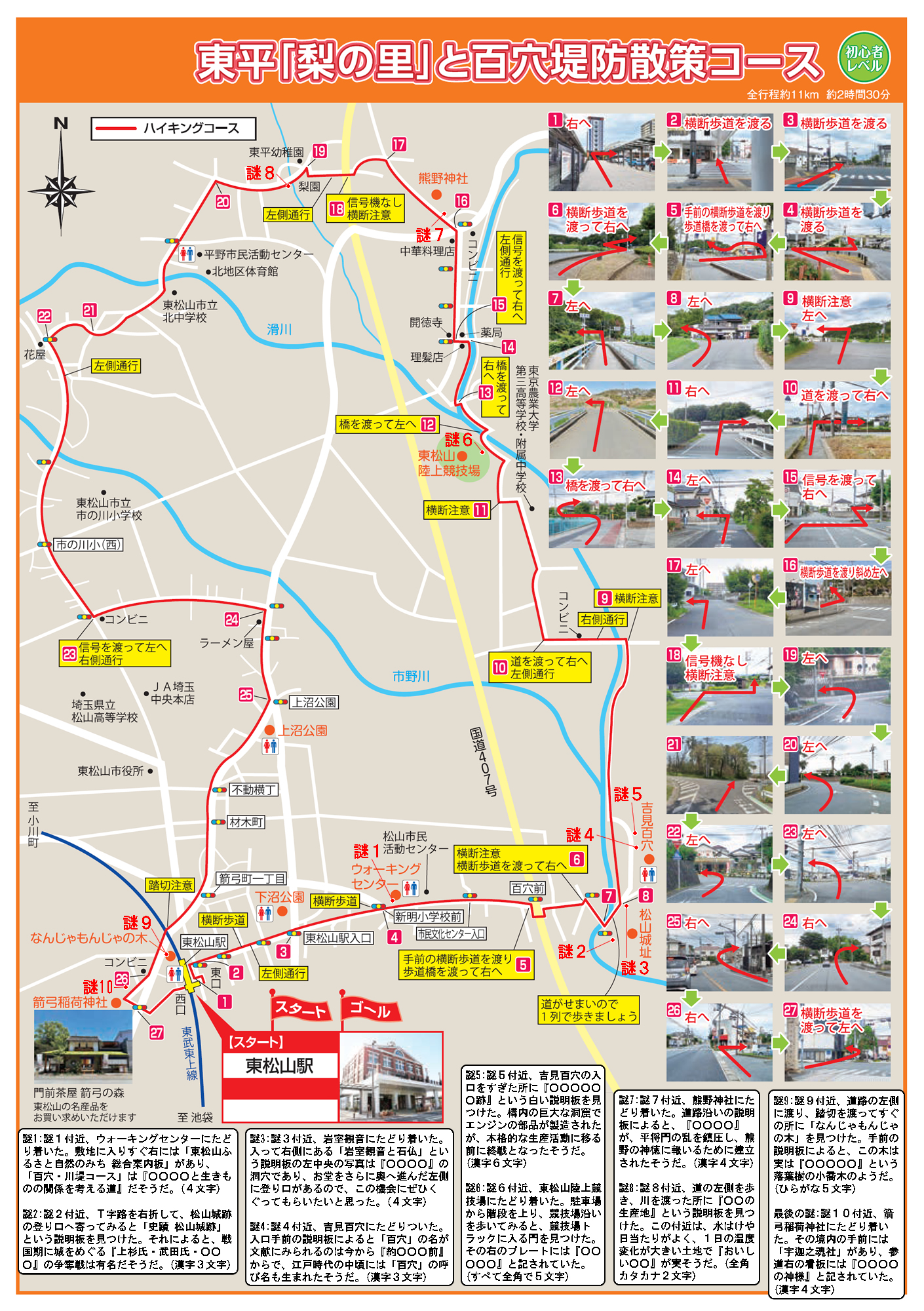 謎1:地図の謎1付近、ウォーキングセンターにたどり着いた。敷地に入りすぐ右には「東松山ふるさと自然のみち 総合案内板」があり、「百穴・川堤コース」は『○○○○と生きものの関係を考える道』だそうだ。(4文字)