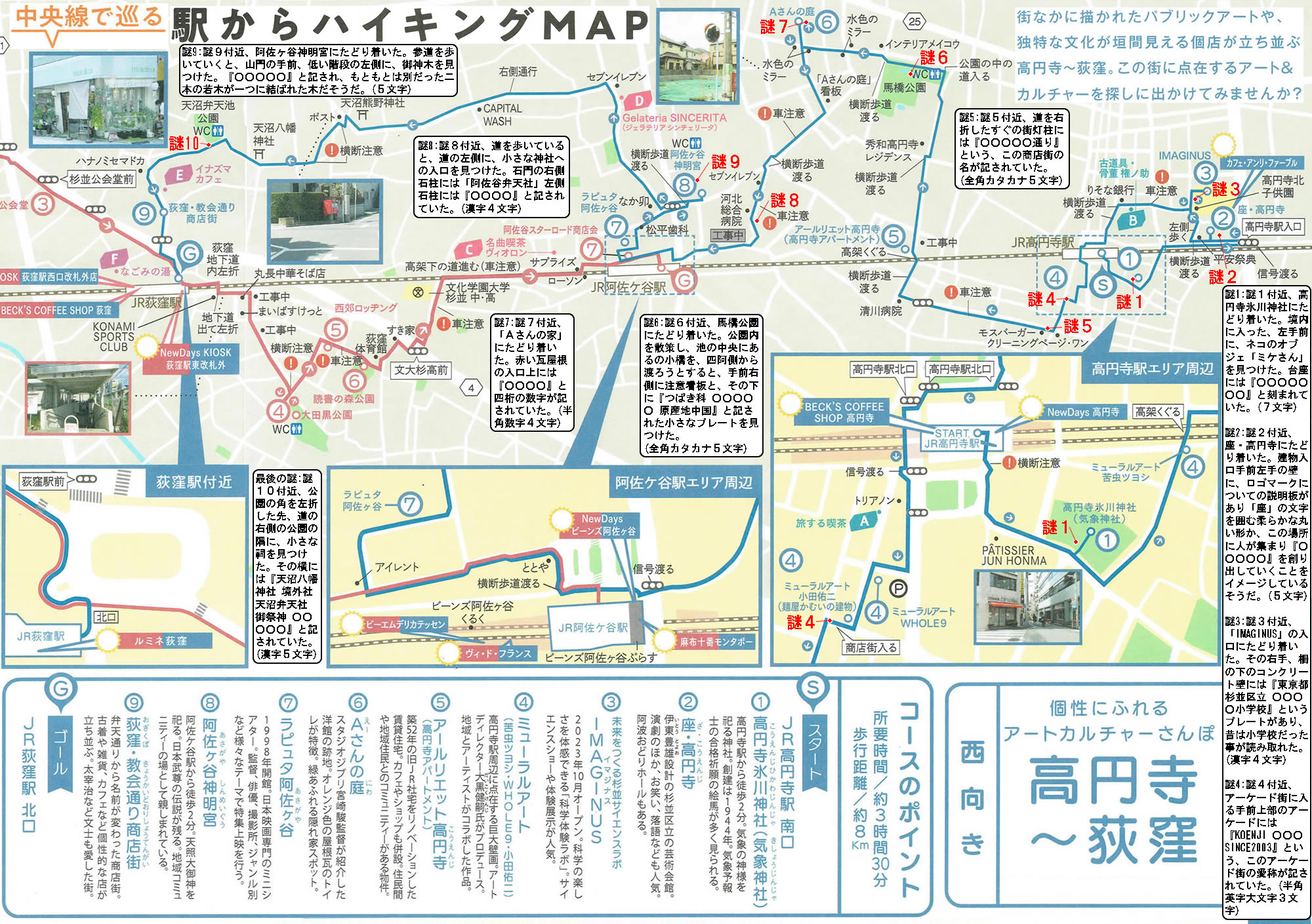 謎1:地図の謎1付近、高円寺氷川神社にたどり着いた。境内に入った、左手前に、ネコのオブジェ「ミケさん」を見つけた。台座には『○○○○○○○』と刻まれていた。(7文字)