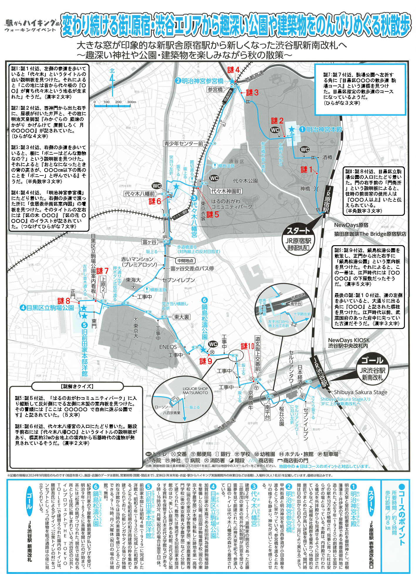 謎1:地図の謎1付近、左側の参道を歩いていると「代々木」というタイトルの白い説明板を見つけた。それによると「この地には昔から代々樅の『○○』が育ち代々木という地名が生まれた」そうだ。(漢字2文字)