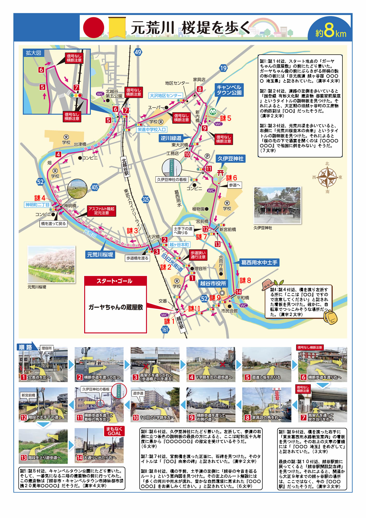 謎1:地図の謎1付近、スタート地点の「ガーヤちゃんの蔵屋敷」の前にたどり着いた。ガーヤちゃん像の前にぶらさがる将棋の駒の形の板には「日光街道 越ヶ谷宿 ○○○○ 埼玉県」と記されていた。(漢字4文字)