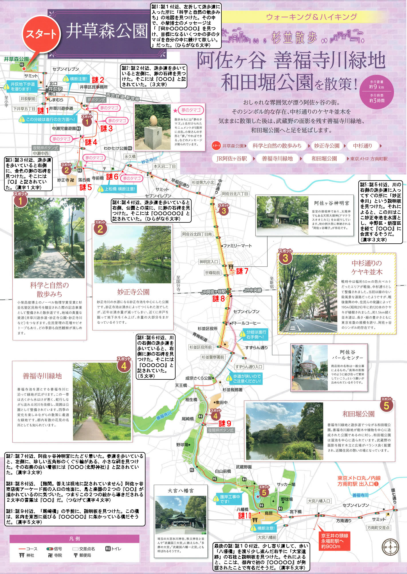 謎1:地図の謎1付近、左折して遊歩道に入った所に「科学と自然の散歩みち」の地図を見つけた。その中で、小柴博士のメッセージは「『何か○○○○○○』を見つけ、目標になるいくつかの夢のタマゴを自分の中に続けて欲しい。」だった。(ひらがな6文字)