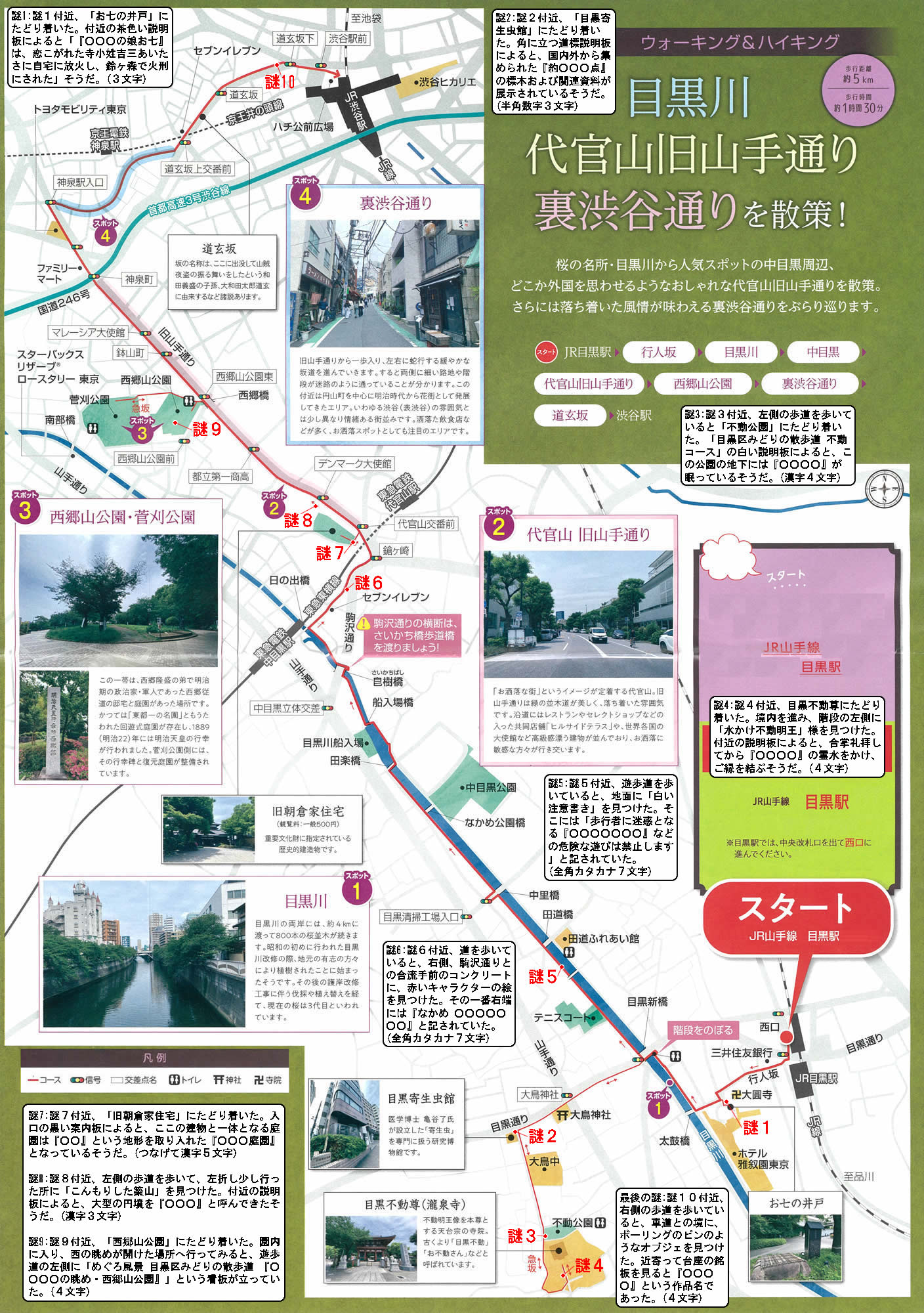 謎1:地図の謎1付近、「お七の井戸」にたどり着いた。付近の茶色い説明板によると「『○○○の娘お七』は、恋こがれた寺小姓吉三あいたさに自宅に放火し、鈴ヶ森で火刑にされた」そうだ。(3文字)