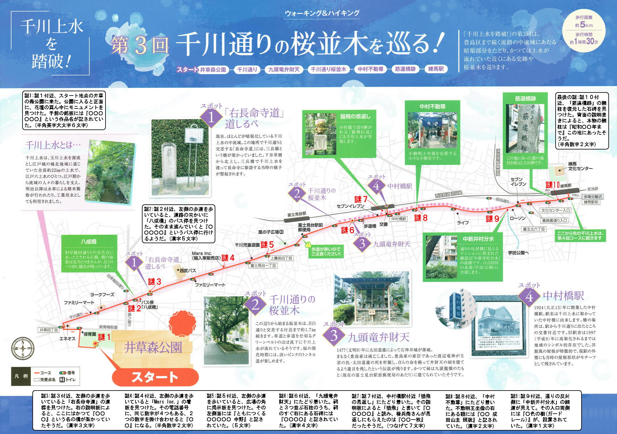 謎1:地図の謎1付近、スタート地点の井草の森公園に来た。公園に入ると正面に、花壇の真ん中にモニュメントを見つけた。手前の銘板には『○○○ ○○○』という作品名が記されていた。(半角英字大文字6文字)