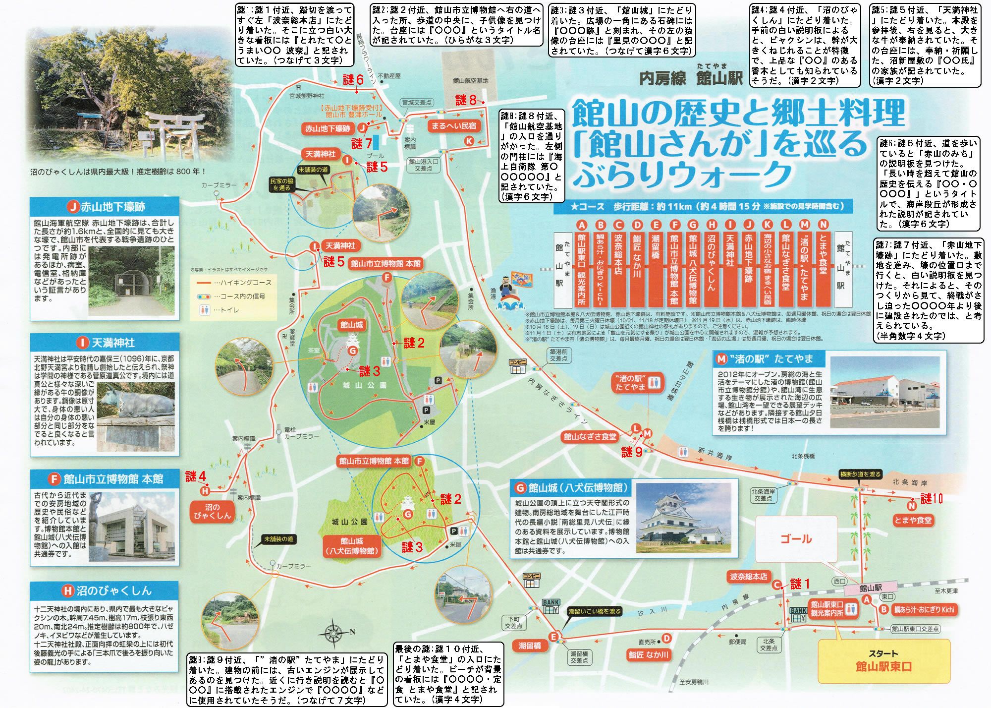 謎1:地図の謎1付近、踏切を渡ってすぐ左「波奈総本店」にたどり着いた。そこに立つ白い大きな看板には『とれたて○とうまい○○ 波奈』と記されていた。(つなげて3文字)