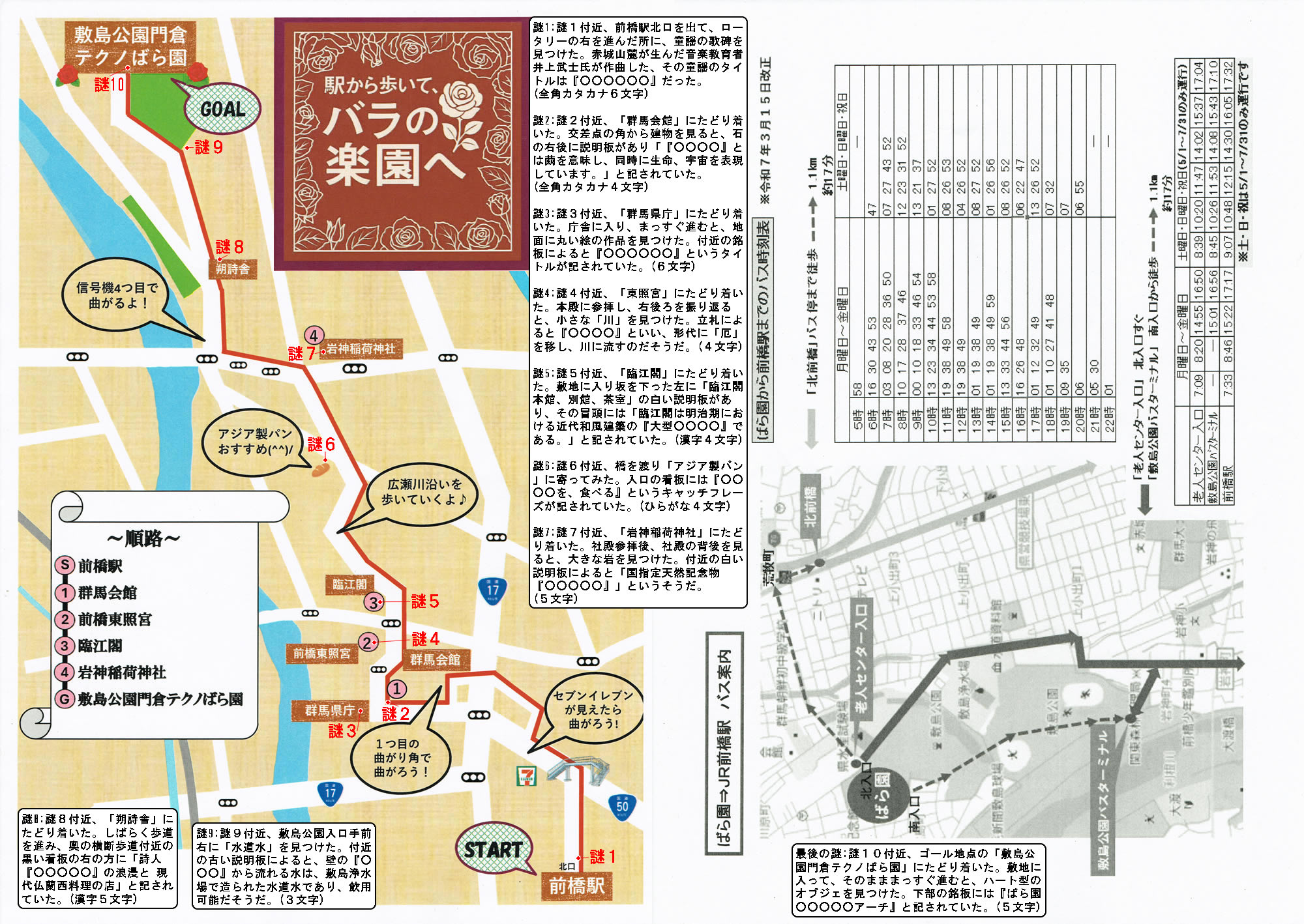 謎1:地図の謎1付近、前橋駅北口を出て、ロータリーの右を進んだ所に、童謡の歌碑を見つけた。赤城山麓が生んだ音楽教育者井上武士氏が作曲した、その童謡のタイトルは『○○○○○○』だった。(全角カタカナ6文字)