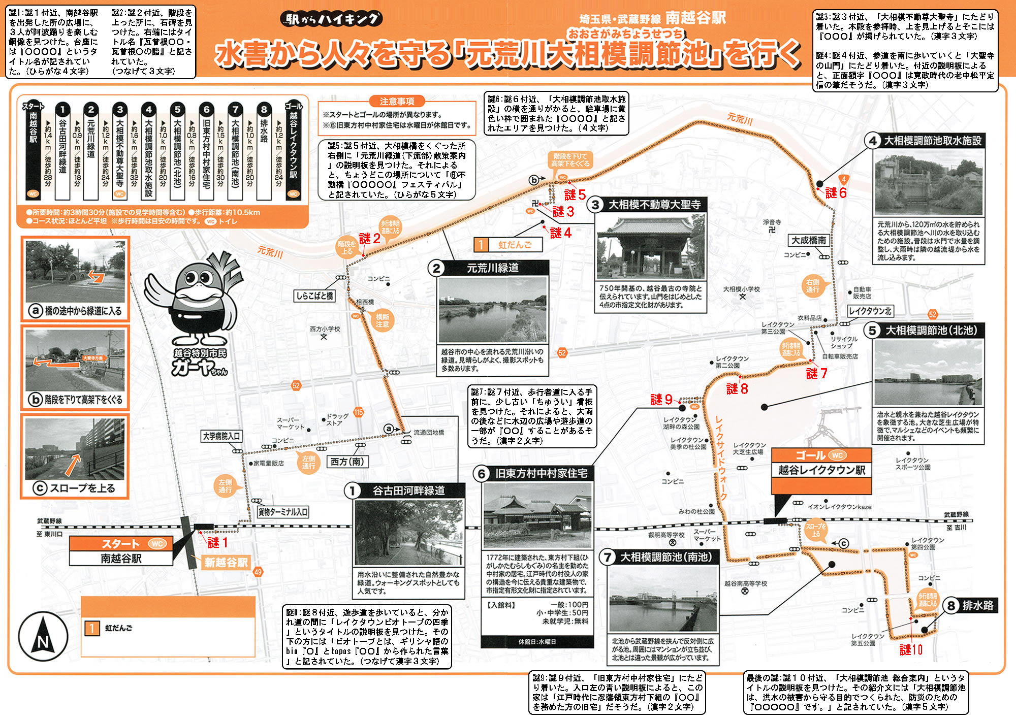謎1:地図の謎1付近、南越谷駅を出発した所の広場に、3人が阿波踊りを楽しむ銅像を見つけた。台座には『○○○○』というタイトル名が記されていた。(ひらがな4文字)