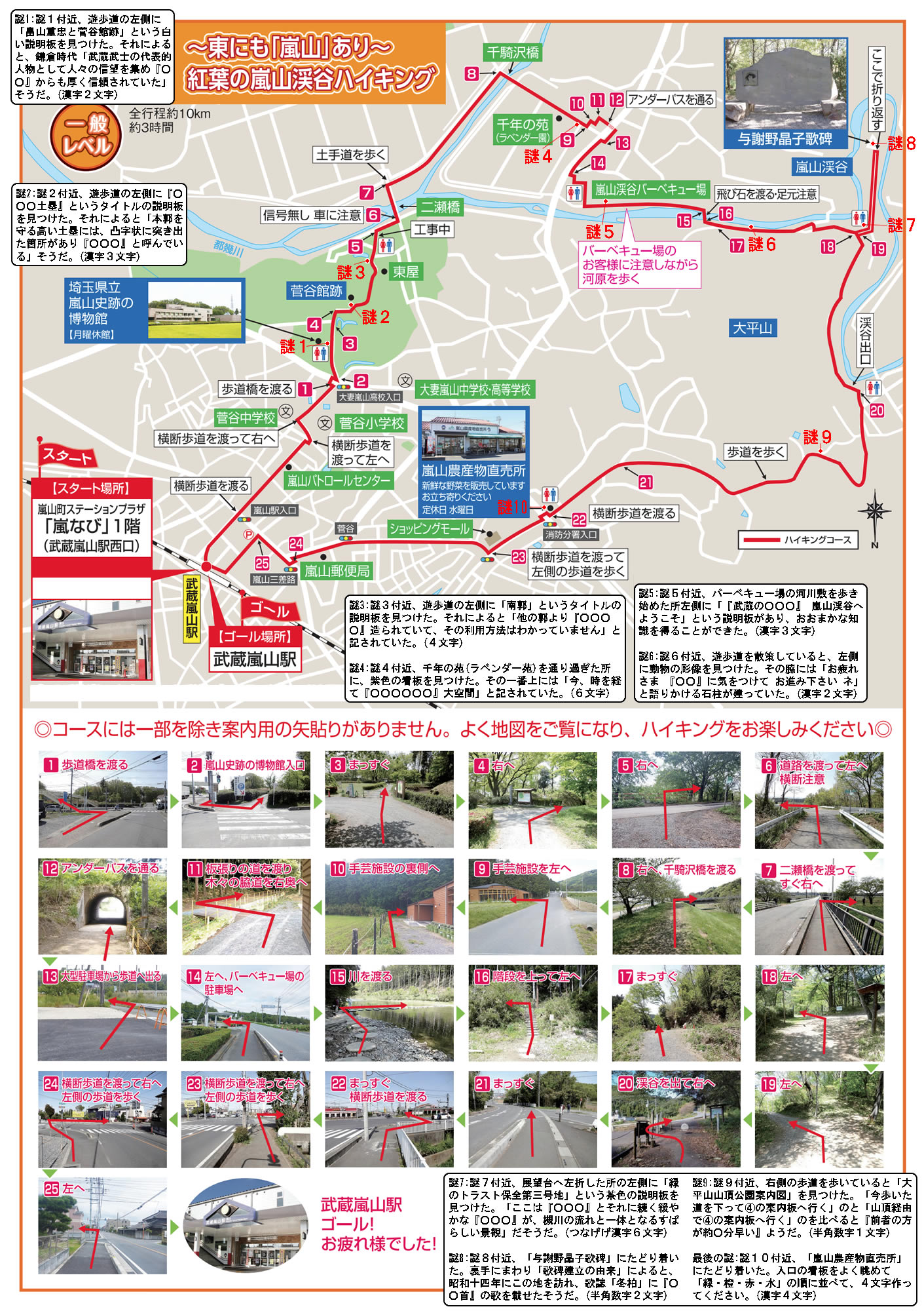 謎1:地図の謎1付近、遊歩道の左側に「畠山重忠と菅谷館跡」という白い説明板を見つけた。それによると、鎌倉時代「武蔵武士の代表的人物として人々の信望を集め『○○』からも厚く信頼されていた」そうだ。(漢字2文字)
